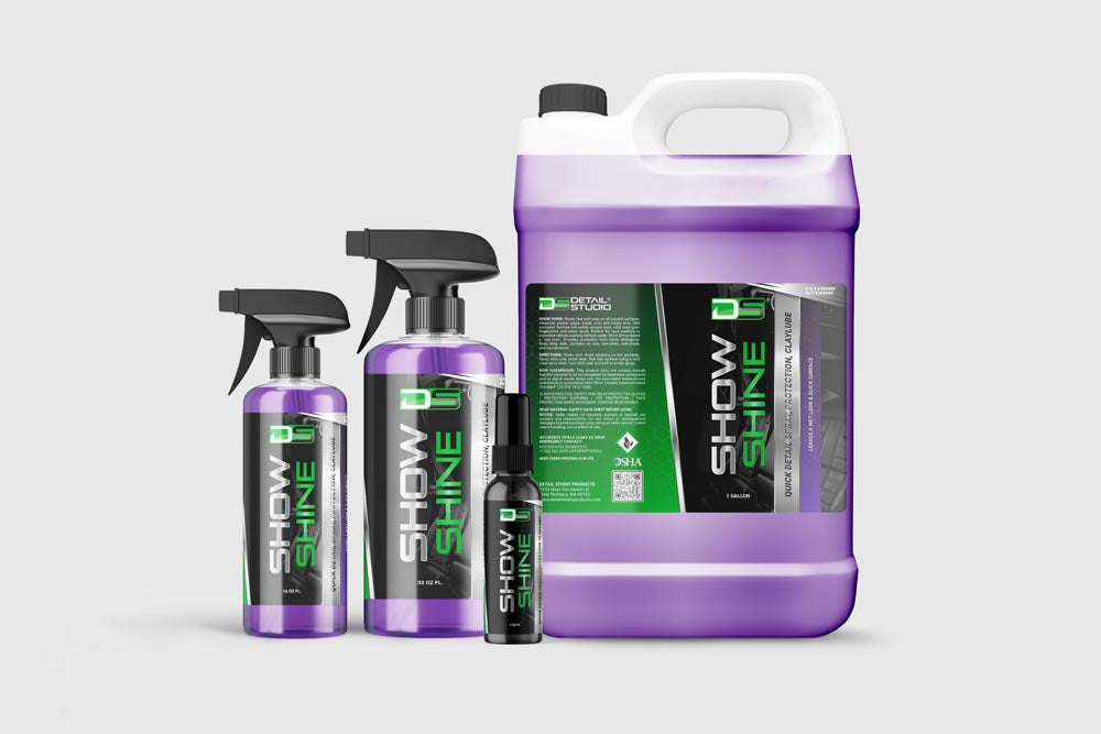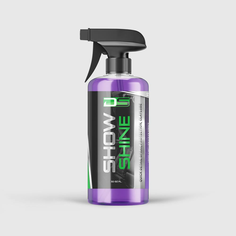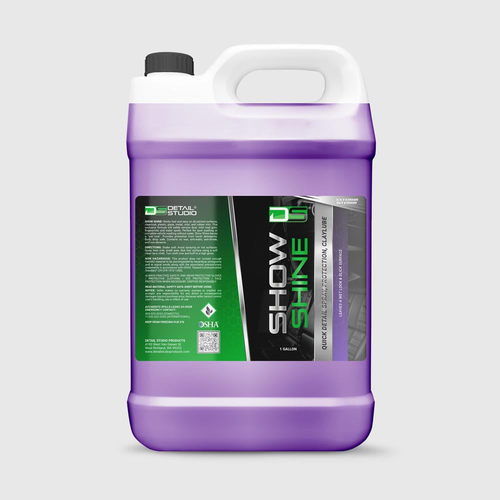 Show Shine works fast and easy on all painted surfaces, can be used as a clay lubricant and is safe clearcoat, plastic, glass, metal, vinyl, rubber trim. This exclusive formula will safely remove dust, mild road grime, fingerprints and light water spots. Perfect for spot washing or complete vehicle washing without water. Show Shine leaves a “wet look” shine. Body shop safe. Contains no wax. Anti-static and anti-streak. Non-abrasive and non-silicone.